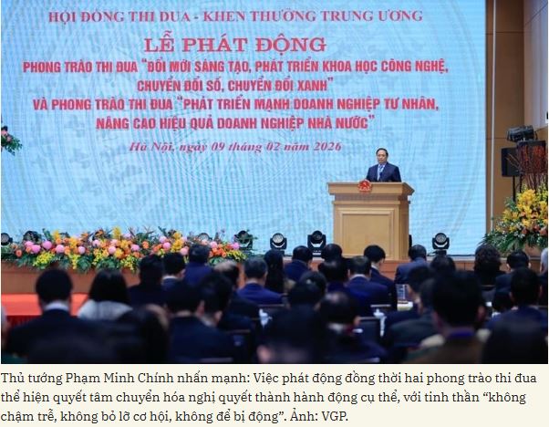 Trong giai đoạn 2020-2025 đầy thử thách, các phong trào thi đua do Hội đồng Thi đua - Khen thưởng Trung ương phát động đã tạo nên những dấu ấn đặc biệt, góp phần giúp đất nước vượt qua đại dịch COVID-19, đẩy nhanh phát triển hạ tầng chiến lược, thúc đẩy chuyển đổi số, xóa nhà tạm, nhà dột nát, triển khai nhiều công trình trọng điểm quốc gia với tốc độ chưa từng có... Những kết quả đó khẳng định, thi đua không phải khẩu hiệu, mà là phương thức tổ chức hành động hiệu quả, tạo sức lan tỏa rộng khắp và huy động được mọi nguồn lực xã hội. Theo Thủ tướng, Đại hội XIV của Đảng đã mở ra kỷ nguyên phát triển mới, xác lập tầm nhìn chiến lược dài hạn với mục tiêu đưa Việt Nam trở thành quốc gia phát triển, thu nhập cao theo định hướng xã hội chủ nghĩa. Song song với đó, Bộ Chính trị đã ban hành nhiều nghị quyết chuyên đề quan trọng, tạo nền tảng cho tăng trưởng nhanh và bền vững, trong đó nổi bật là các nghị quyết về phát triển khoa học - công nghệ, chuyển đổi số quốc gia, phát triển kinh tế tư nhân và nâng cao vai trò của kinh tế nhà nước. Trong bối cảnh thế giới nhiều biến động, Đại hội XIV xác định rõ yêu cầu tự chủ chiến lược, tự cường, tự tin vươn lên bằng nội lực, không bị động, không phụ thuộc, đồng thời chủ động hội nhập quốc tế sâu rộng, linh hoạt và hiệu quả. Khoa học - công nghệ và chuyển đổi xanh là con đường ngắn nhất để tự chủ Người đứng đầu Chính phủ nhấn mạnh, con đường nhanh nhất, hiệu quả nhất để đạt được tự chủ chiến lược chính là phát triển khoa học - công nghệ, đổi mới sáng tạo, chuyển đổi số và chuyển đổi xanh, gắn với xây dựng nền kinh tế độc lập, tự chủ. Đây không chỉ là xu thế toàn cầu, mà còn là lựa chọn chiến lược mang tính tất yếu của Việt Nam. Việc làm chủ công nghệ, phát triển kinh tế số, kinh tế xanh, kinh tế tuần hoàn và kinh tế tri thức đòi hỏi sự tham gia chủ động, tiên phong của cộng đồng doanh nghiệp, trong đó kinh tế nhà nước giữ vai trò chủ đạo, còn kinh tế tư nhân là một trong những động lực quan trọng nhất của nền kinh tế. Việc phát động đồng thời hai phong trào thi đua thể hiện quyết tâm chuyển hóa nghị quyết thành hành động cụ thể, với tinh thần “không chậm trễ, không bỏ lỡ cơ hội, không để bị động”.