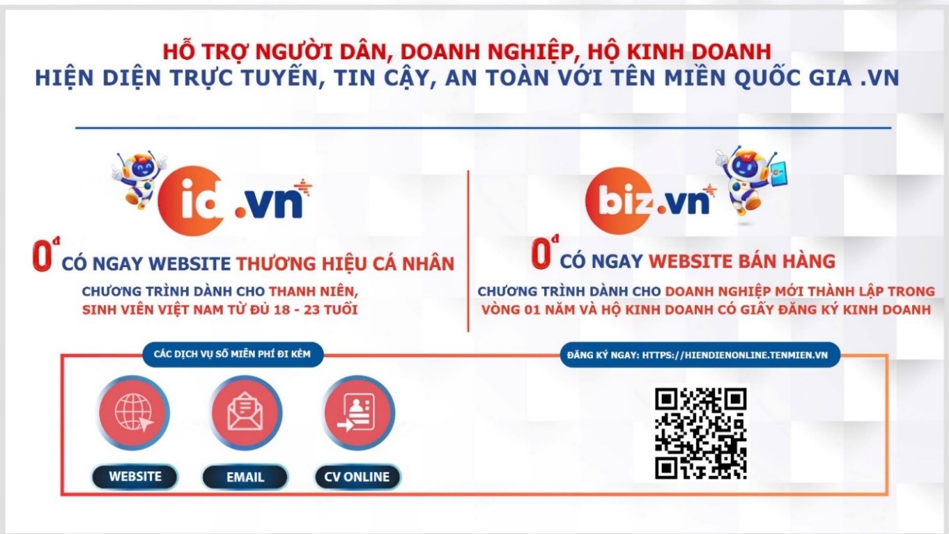 Chương trình Hiện diện trực tuyến với tên miền quốc gia .vn là sáng kiến của Bộ Thông tin và Truyền thông khởi xướng nhằm phổ cập tên miền “.vn” tới toàn dân, được triển khai với trên quy mô trên cả nước. Với chính sách thúc đẩy, hỗ trợ đặc biệt, Chương trình hỗ trợ cá nhân, hộ kinh doanh, doanh nghiệp mới thành lập xây dựng một môi trường trực tuyến an toàn, chuyên nghiệp và tin cậy thông qua việc đăng ký và sử dụng tên miền ".vn" với các dịch vụ số (website, email …). Cụ thể: (1) miễn phí 2 năm tên miền và các dịch vụ số đi kèm (email/website) đối với tên miền “biz.vn” dành doanh nghiệp mới thành lập trong vòng 01 năm và cho các hộ kinh doanh cá thể; (2) miễn phí 2 năm tên miền và các dịch vụ số đi kèm (email/website) đối với tên miền “id.vn” cho thanh niên, sinh viên Việt Nam trong độ tuổi từ đủ 18-23 tuổi.