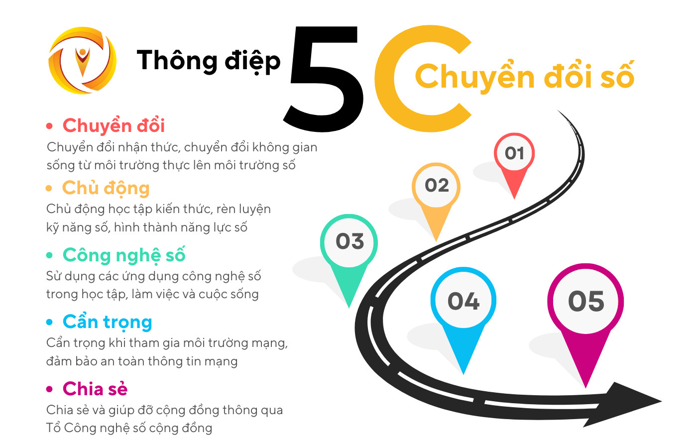 Dưới đây là Thông điệp 5C – Chuyển đổi, Chủ động, Công nghệ số, Cẩn trọng và Chia sẻ, tương ứng với 5 việc làm, hoạt động mỗi thanh niên, người trẻ cần tích cực thực hiện để phát huy vai trò của tuổi trẻ tiên phong trong chuyển đổi số.